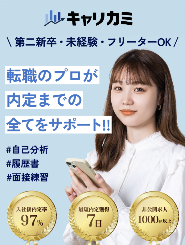 キャリカミは、20代・未経験・第二新卒・フリーター向けに特化した完全無料の転職支援サービスです。