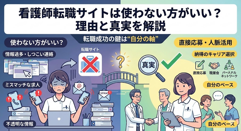 看護師転職サイト(転職支援サービス)は、求人探しから面接調整、条件交渉まで無料でサポートしてくれる便利な仕組みです。 一方でネット上では「使わない方がいい」「しつこい」「希望と違う求人ばかり」といった声も見かけ、不安に感じる方も多いのでは...