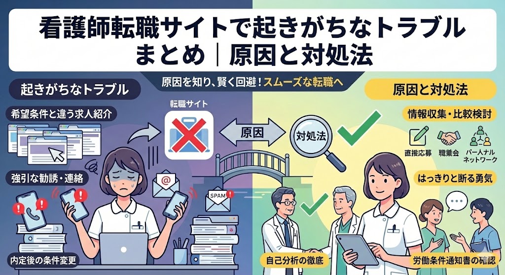 転職を考える看護師さんにとって、看護師専門の転職サイトは心強い味方です。 しかし一方で、「連絡がしつこい」「希望と違う求人ばかり紹介される」など様々なトラブル事例も報告されています。 不安を感じて転職活動をためらう方もいるでしょう。 本記事... -