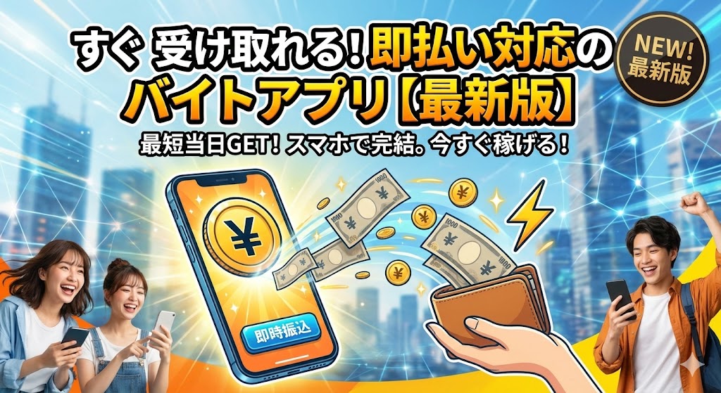 「今日中にお金が必要」 そんなときに心強いのが、即払い(即日・前払い)に対応したバイトアプリです。 最近は、面接や履歴書なしで働けて、働いた分の報酬を早めに受け取れるアプリが増えてきました。 本ページでは、使いやすさ・求人数・即払い対応のし... -