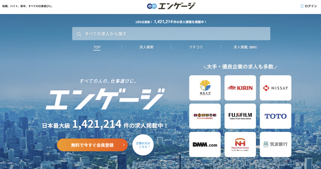 エンゲージは、東証一部上場であるエン株式会社(旧 エン・ジャパン株式会社)が運営する国内最大級の求人サイトです。