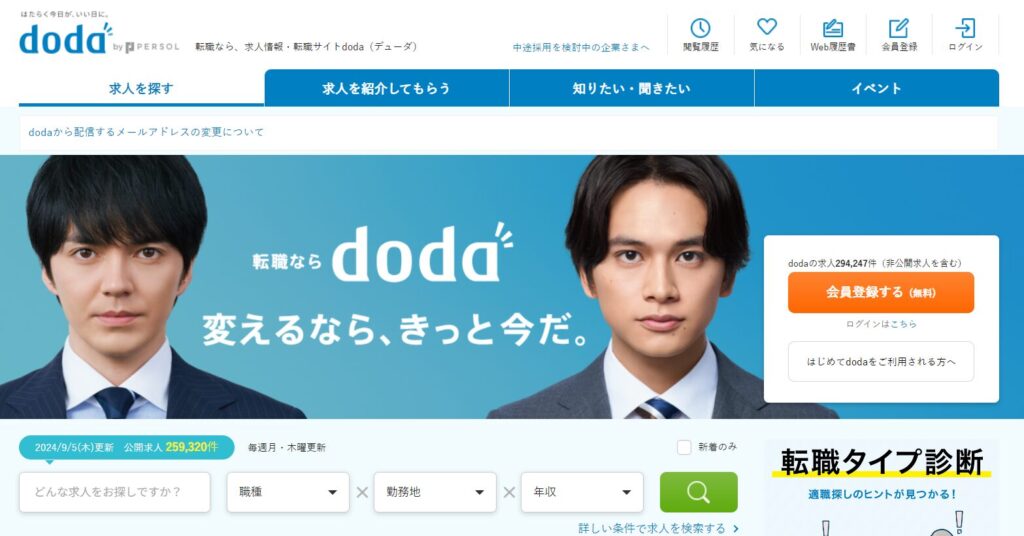 『doda』は、「変えるなら、きっと今だ」というテーマを掲げているハイクラス向け転職エージェントです。