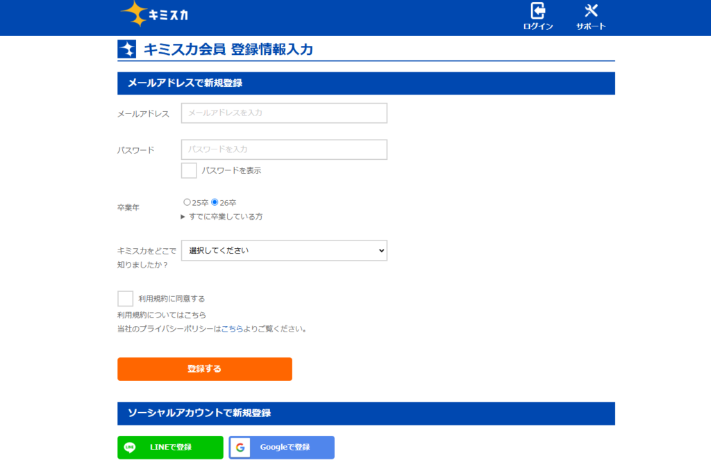 まずは『キミスカの公式サイト』から会員登録を行います。