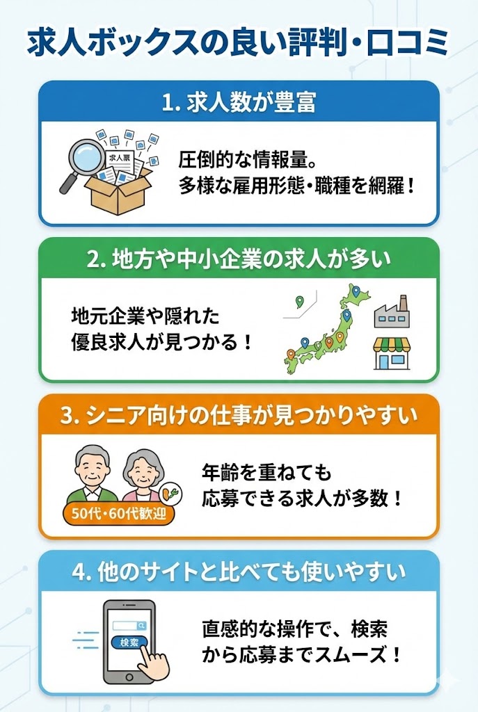 求人ボックスでは、ミドルシニア〜シニア向けの仕事も多く掲載されていると口コミがありました。