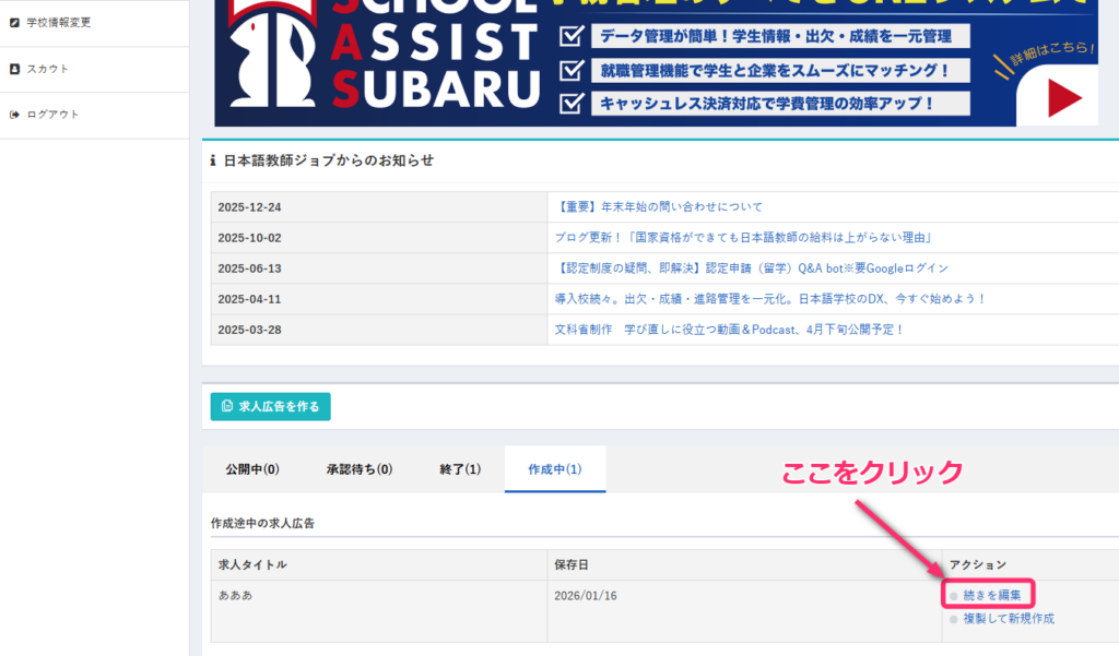 マイページの「作成中」一覧から該当の求人を選び、**「続きを編集」**をクリックすると、保存した内容の続きから編集できます。