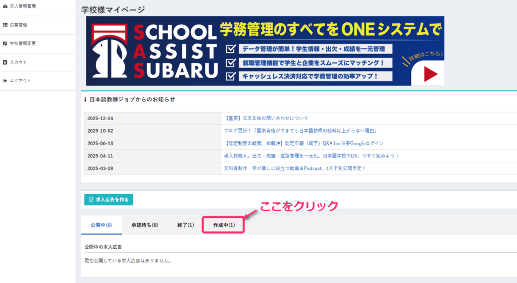 該当の求人を確認する場合は、「作成中」をクリックしてください。