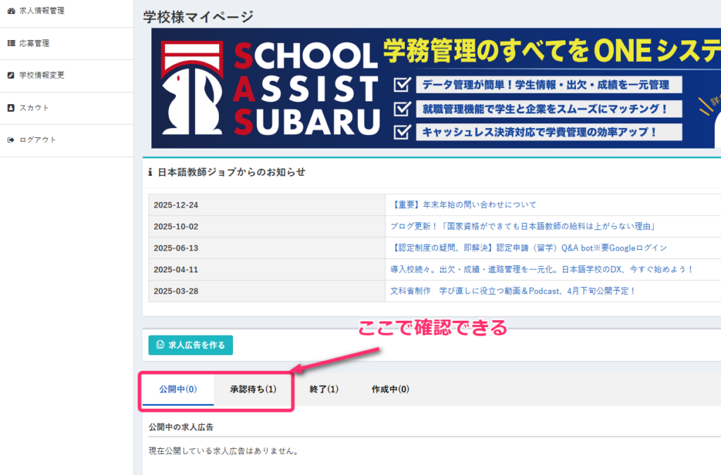 求人の公開状況は、マイページ中段に表示される「承認待ち」「公開中」ステータスで確認できます。