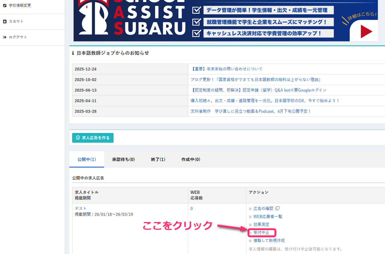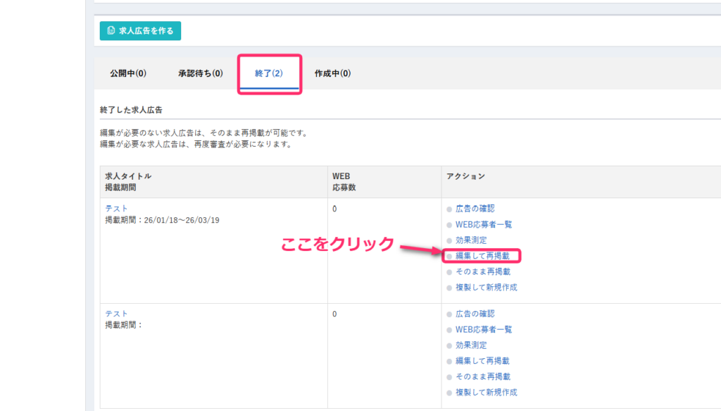 修正内容が一部であっても、公開中の求人は直接編集できないため、一度「受付中止」にしてから編集を行ってください。 - 公開終了中に応募は入りますか?