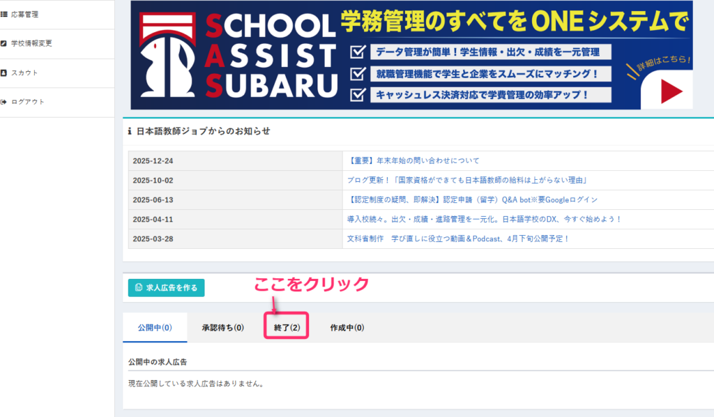 公開終了中の求人は、サイト上では表示されず、求職者から閲覧できない状態となります。