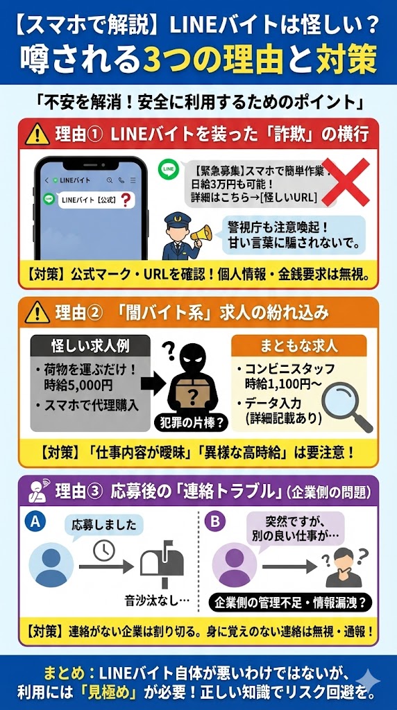 これらはあくまで第三者による詐欺であり、LINEバイトの公式サービスの問題ではありません。