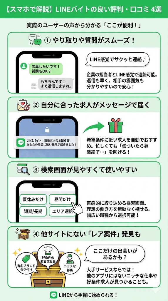 ネットに疎い方でもサクッと希望条件に近い仕事を探せる便利さは、LINEバイトならではの評価ポイントです。