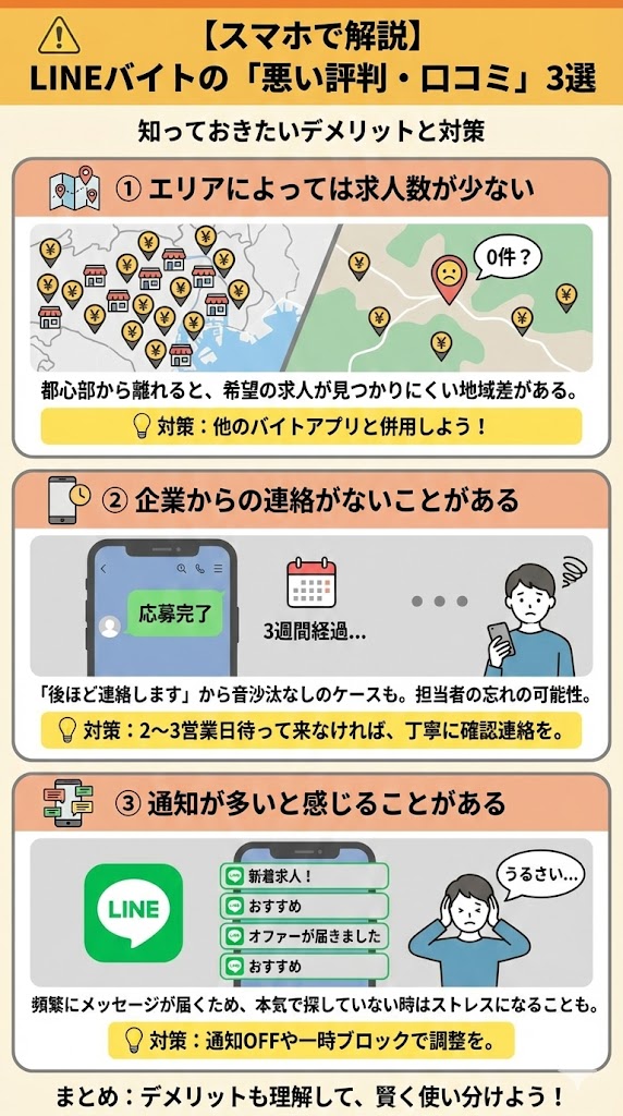 ここでは、LINEバイトに寄せられる悪い評判・口コミについて解説します。
