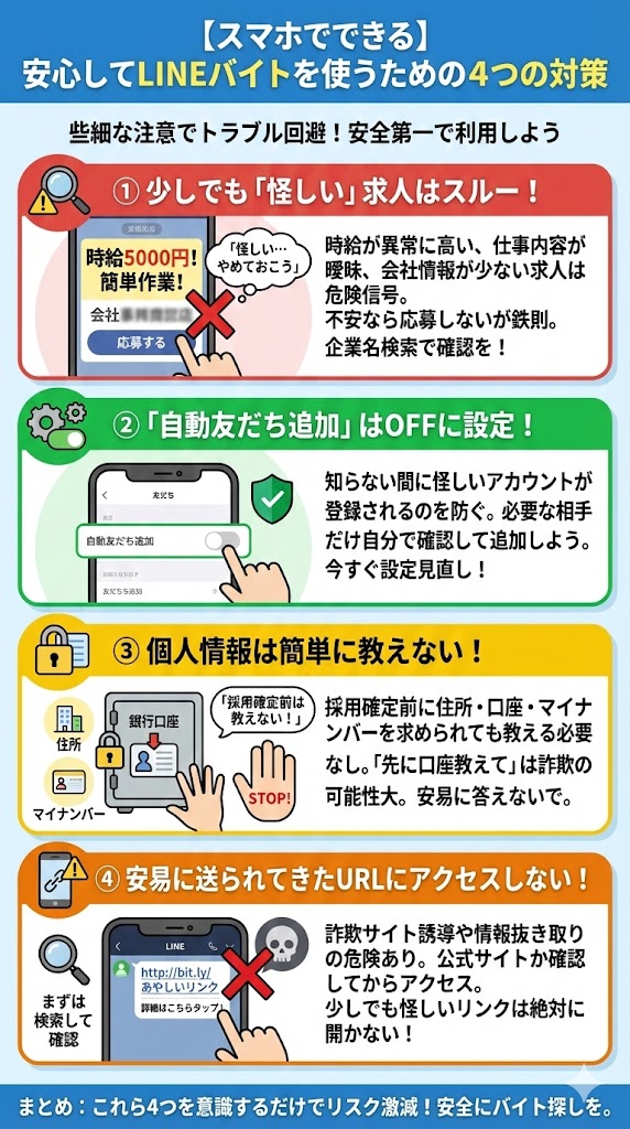 安心してLINEバイトを利用するための最も基本的な対策は、「少しでも怪しい」と感じた求人には絶対に応募しないことです。