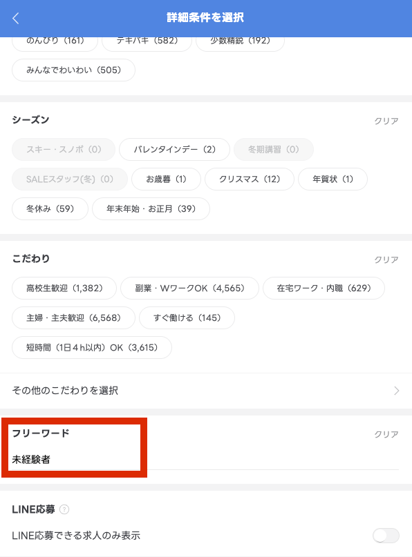 求人を検索する際、詳細条件をタップしてフリーワード入力に「未経験者」と入力しておくと、効率よく未経験者歓迎の仕事を見つけられます。