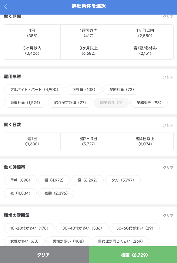 例えば働く期間を指定する条件は、単発や短期などではなく、「1日」「1週間以内」「春/夏/冬休み」など希望条件に近い内容で指定できます。