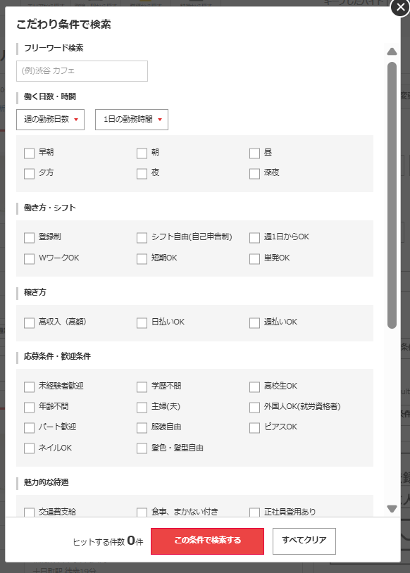 短期・単発バイトから長期雇用まで幅広く取り扱っており、「1日のみOK」「週1日〜OK」「シフト自由」「日払いOK」「高校生OK」「深夜勤務」「在宅ワーク」など、細かい条件で検索できます。