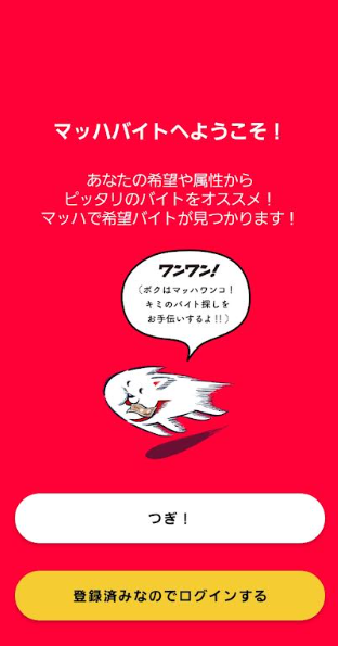 アプリを開くと、赤い背景にマスコット「マッハワンコ」が登場します。