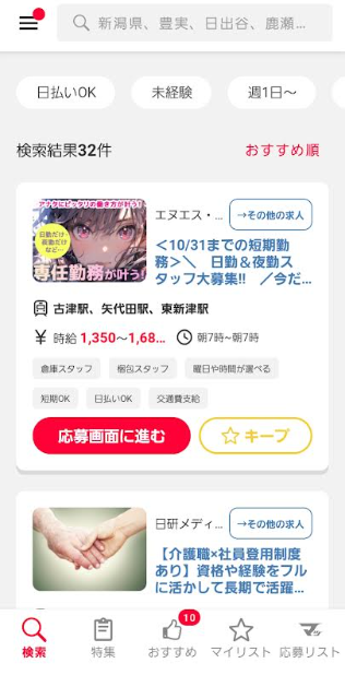 「エリア」「職種」「特徴(日払い・短期など)」を選んで、気になる求人を探しましょう。