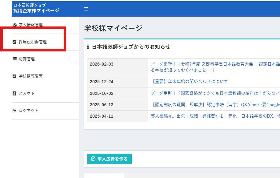学校様マイページ(https://nihongokyoshi-job.com/mycom/)にログインします。