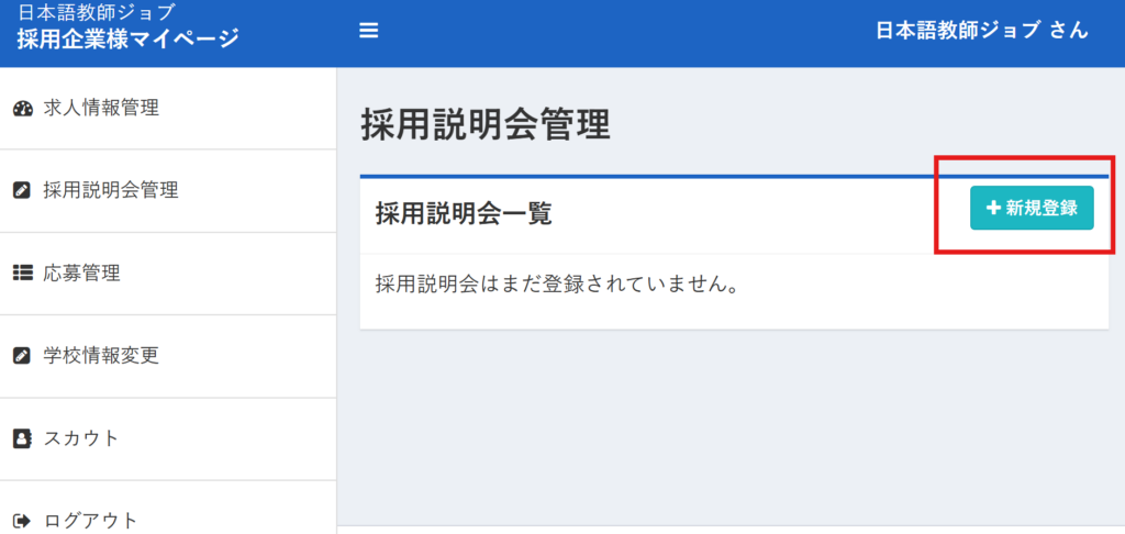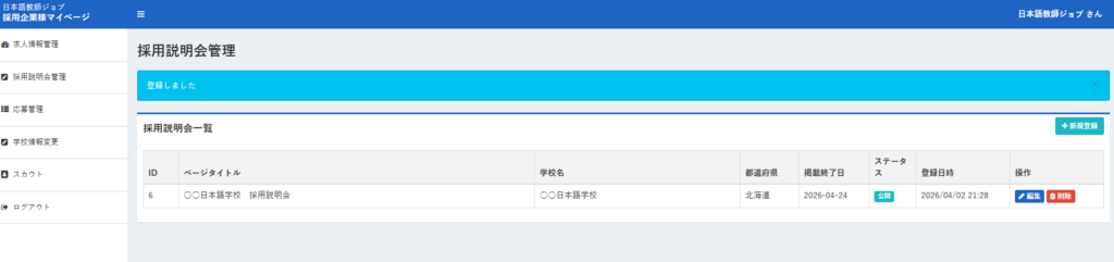登録が完了すると、採用説明会一覧に戻り、作成したページが表示されます。なお採用説明会は複数作成できます。ご希望の場合は「新規登録」ボタンをクリックして追加してください。