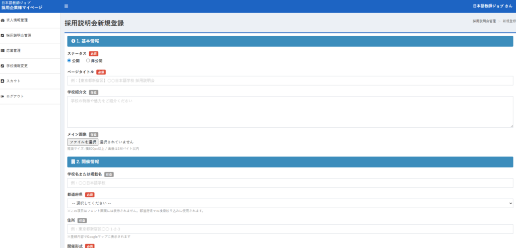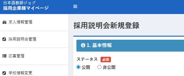 | ページタイトル | 必須 | 説明会のタイトルを入力(例:【東京都新宿区】○○日本語学校 採用説明会) |