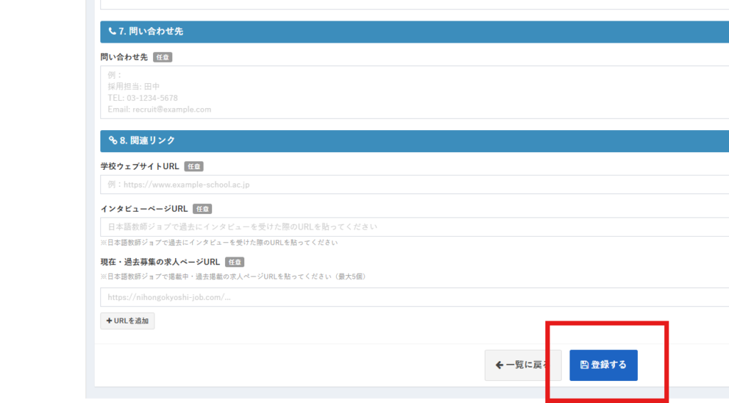| 現在・過去募集の求人ページURL | 任意 | 日本語教師ジョブで掲載中・過去掲載の求人ページURLを入力(最大5個。「URLを追加」ボタンで追加可能) |