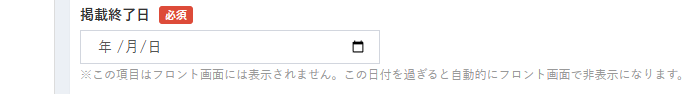 | 掲載終了日 | 必須 | カレンダーから日付を選択。この日を過ぎると自動的に非表示になる。※フロント画面には表示されない |