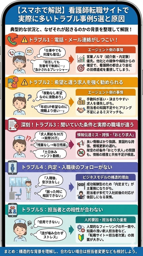 上記のようなトラブルが起こる背景には、看護師転職サイト(特にエージェント型)の仕組みや人間関係、情報精度の問題があります。