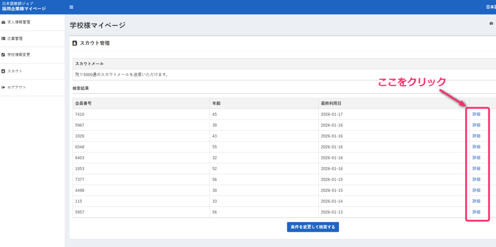 検索結果から候補者の「詳細」をクリック。