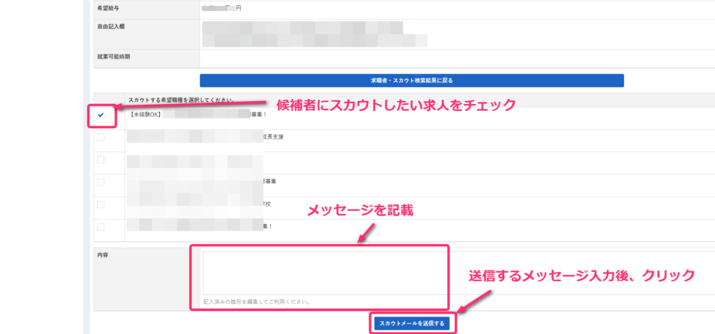 スカウトする求人をチェック、メッセージを入力したら「スカウトメールを送信する」ボタンを押してください。