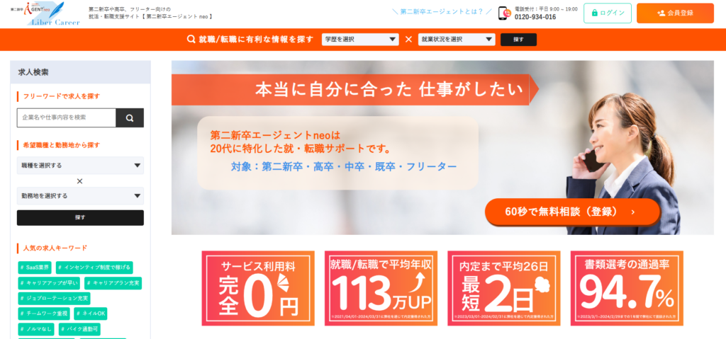 第二新卒エージェントneo非公開20代全職種あり(エージェント専門)全国(首都圏・関西中心)第二新卒・既卒に特化した専門エージェント