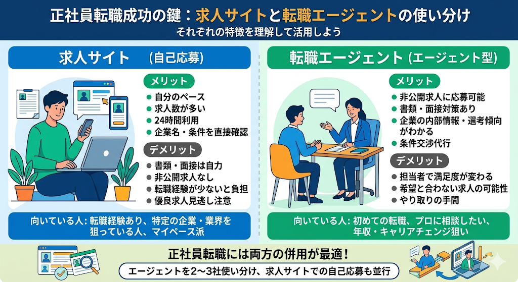 どちらか一方ではなく、両方の併用がおすすめです。求人サイトは幅広い求人を自分のペースで探すのに向いており、エージェントは非公開求人の紹介やプロのサポートを受けたい場合に向いています。
