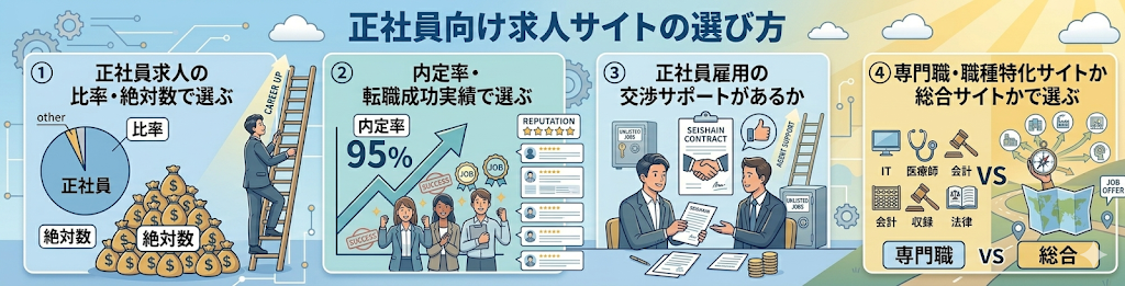 正社員求人の応募で最も意識すべきことは、「求人サイトとエージェントをそれぞれの強みに合わせて使い分けること」です。