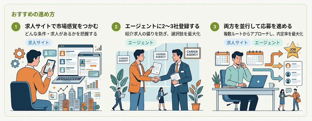 エージェントを2〜3社使い分けながら、求人サイトでの自己応募も並行して進めるスタンダードな方法が、現在もっとも多くの転職成功者が実践しています。