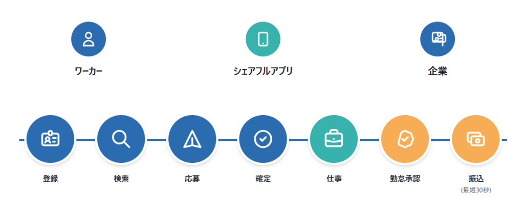 シェアフル」は、空き時間に働きたい個人と短時間の人手を求める企業をアプリ上で即時に結ぶスキマバイトサービスです。