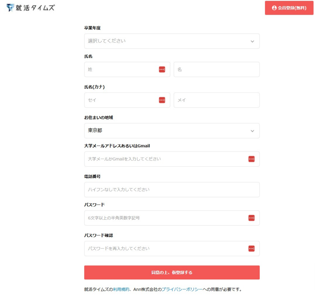 卒業年度や氏名、メールアドレス、などの情報を入力し仮登録をしたら、案内に従って本登録を行います。