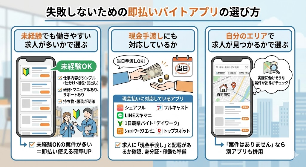 即払いアプリは「短時間で入れる」「家の近くで探せる」「仕事内容がシンプル」かどうかで選ぶと失敗しにくいでしょう。