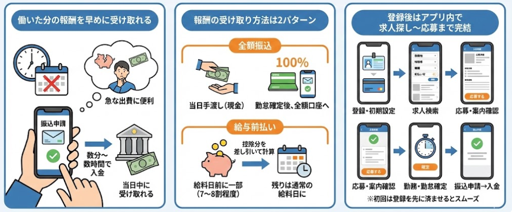 最近は、面接や履歴書なしで働けて、働いた分の報酬を早めに受け取れるアプリが増えてきました。