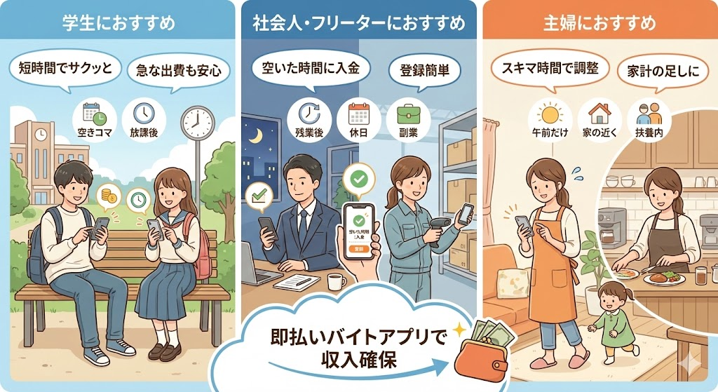 社会人・フリーターは本業があるぶん、即払いアプリは「登録が簡単」「空いた時間に入れる」「入金が早い」かどうかで選ぶと失敗しにくいでしょう。