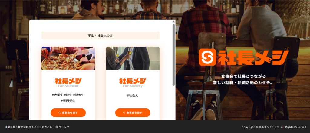 『社長メシ』は現役の社長とご飯を一緒に食べながら就活ができる新しいサービスです。