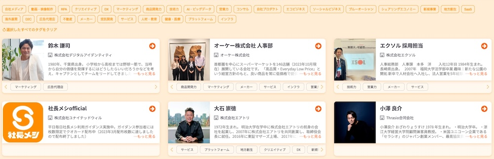 便利なタグ検索を利用すれば気になるジャンルの社長に絞っての検索も可能です。