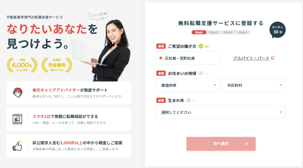 おすすめ特徴 | ・不動産業界の転職に精通したキャリアアドバイザーが在籍 ・スマホで気軽に転職相談が可能 ・不動産業界未経験の登録者が多い |