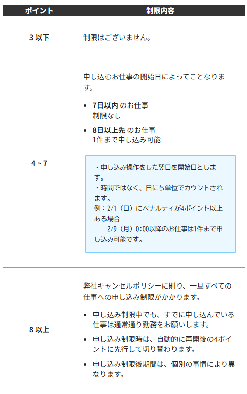 キャンセルのタイミングによってペナルティポイントが付与され、応募が制限されてしまいます。