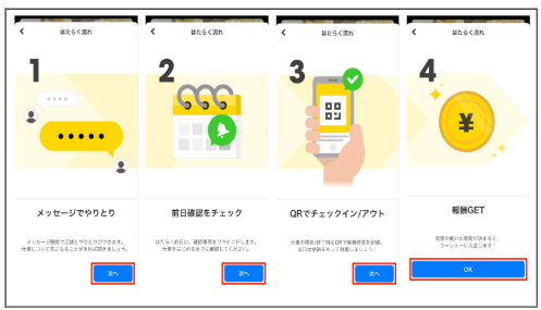 仕事探し、応募、出退勤の打刻、給与振込申請まですべてアプリで完結するので、面倒な手続きがなく、スムーズに働くことができます。