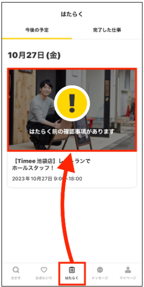 アプリ画面下の「はたらく」のタブを選択し、「働く前の確認事項があります」を選択します。