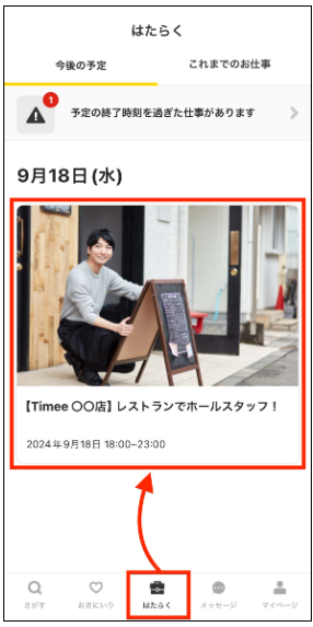 まず、仕事先に着いたら、アプリ画面下の「はたらく」のタブを選択し、「働く前の確認事項があります」を選択します。