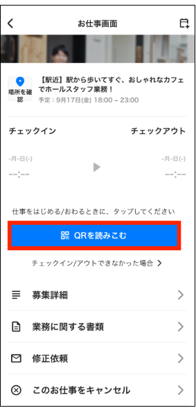 該当の仕事を選択したあと「QRを読み込む」を選択し、仕事先のQRコードを読み込み、チェックイン(出勤打刻)を行います。