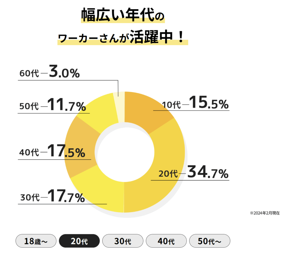 タイミー公式サイトの情報によると、2024年2月時点のタイミー利用者の年代別割合は以下のようになっています。