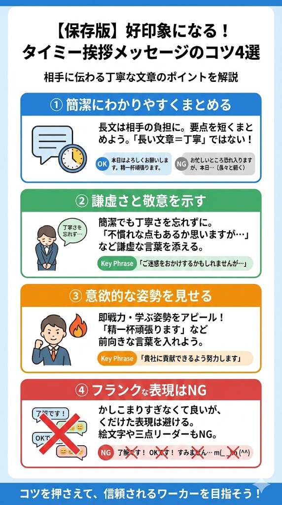 ここでは、「タイミー」で良い印象を与えるための書き方のコツを解説し、相手に伝わる挨拶文の作り方を紹介します。