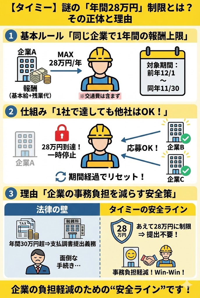 年間28万円の制限は「タイミー全体の収入」ではなく「企業ごとに設定される報酬の上限」。